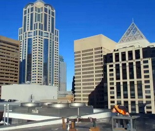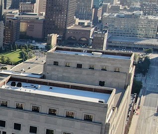 WJE completed a limited visual condition assessment of the exterior metal panels and joint sealant. To document prior repairs and problem areas, we reviewed the metal panels, window assemblies, and joint sealant, in addition to the ground-level storefronts and soffits. During the exterior survey, we also completed adhesion testing of the existing coating on the metal facade panels in accordance with ASTM D3359 and ASTM D4541. We collected coating samples for our in-house laboratory to evaluate the composition and coating types of each sample. The testing results informed contract documents pertaining to joint sealants and high-performance coatings, which were incorporated into a subsequent facade restoration project. We helped the architect of record further refine the full-scale restoration program based on a trial repair of coating removal and installation. We also provided construction period services throughout the implementation of the repairs.